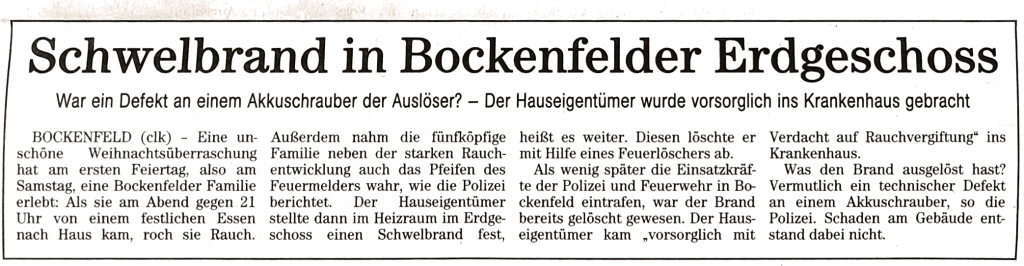 Am 25.12.2021 wurde die Feuerwehr gen 21:04 per Sirene und SMS zu einem Wohnungsbrand in Bockenfeld alarmiert. Als der Eigentümer des Hauses nach Hause kam, bemerkte er im Heizungsraum Qualm sowie das Pfeifen des Feuermelders und alarmierte die Feuerwehr. Im Regal des Raums waren mehrere Batterien, Akkus und Ladegeräte gelagert. Vermutlich wurde der Brand durch einen technischen Defekt an einem Akkuschrauber ausgelöst. Bis zum Eintreffen der Feuerwehr konnten die Besitzer das Feuer mittels Feuerlöscher größtenteils bereits löschen.