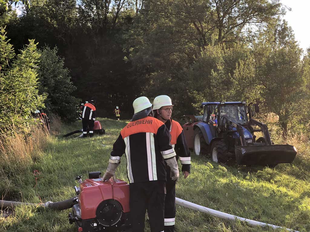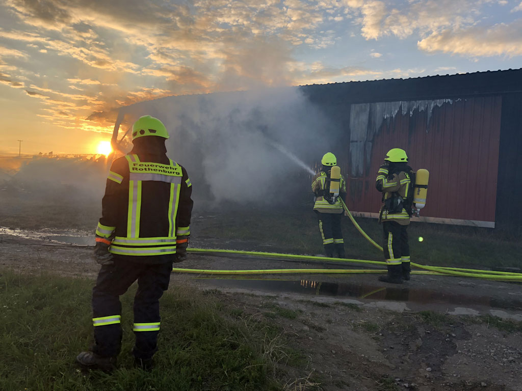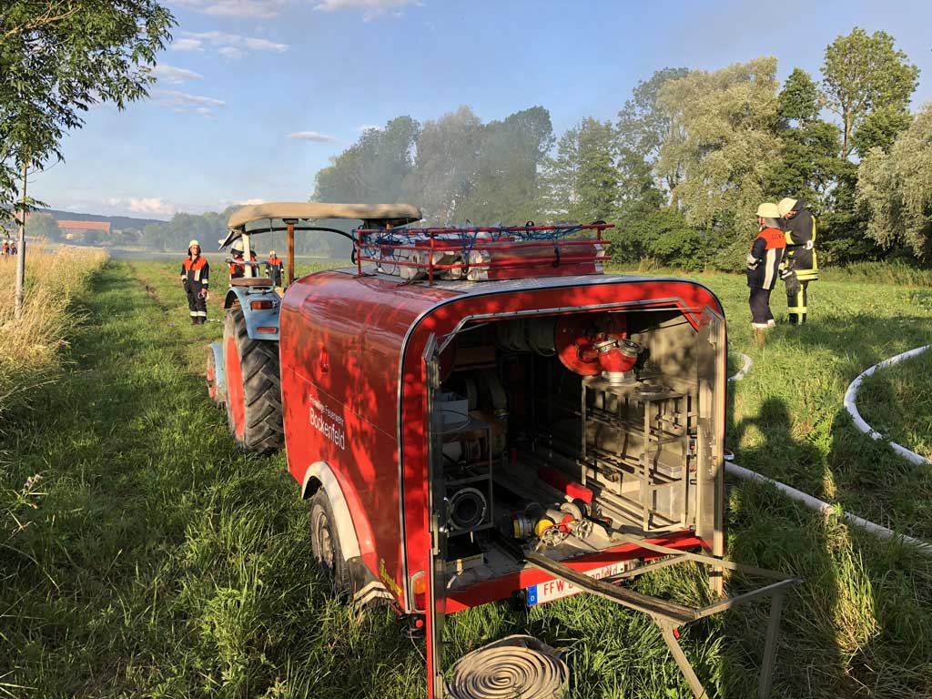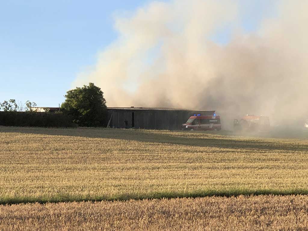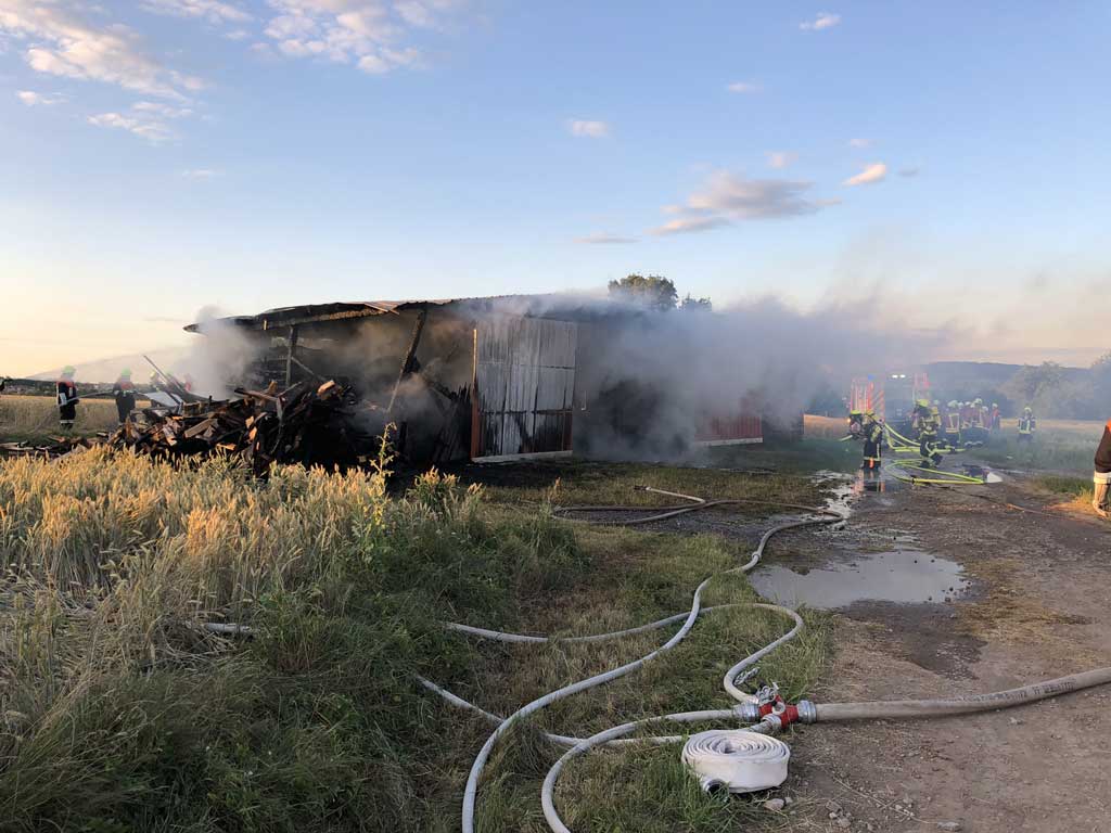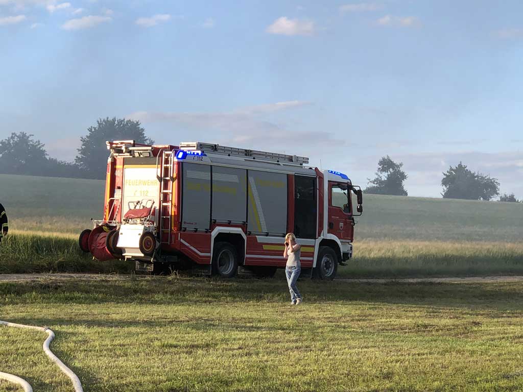 Am 11.07.2020 gegen 19:26 Uhr alarmierte die Sirene die Kammeraden der FFW Bockenfeld. Zwischen Gebsattel und Leuzhof stand eine Feldscheune in Vollbrand. In der Feldscheune war Brennholz gelagert. Wie der Brand entstand ist noch unklar. Die FFW Bockenfeld förderte Wasser aus einen nahegelegenen Weiher und leitete es an die Einsatzstelle weiter. Dort waren insgesamt 3 Trupps unter Atemschutz, welche den Brand in dichtem Rauch löschten. Neben der FFW Bockenfeld waren auch die FFW Gebsattel, FFW Kirnberg, FFW Neusitz und FFW Rothenburg ob der Tauber vor Ort. Die FFW Bockenfeld war mit insgesamt 14 Kammeraden vor Ort. Nachdem der Hauptbrand gelöscht war, übergaben die Bockenfelder die Wasserförderung an die FFW Gebsattel, welche die Brandwache übernahm. Gegen 22:10 Uhr konnte der Einsatz der FFW Bockenfeld beendet werden.
